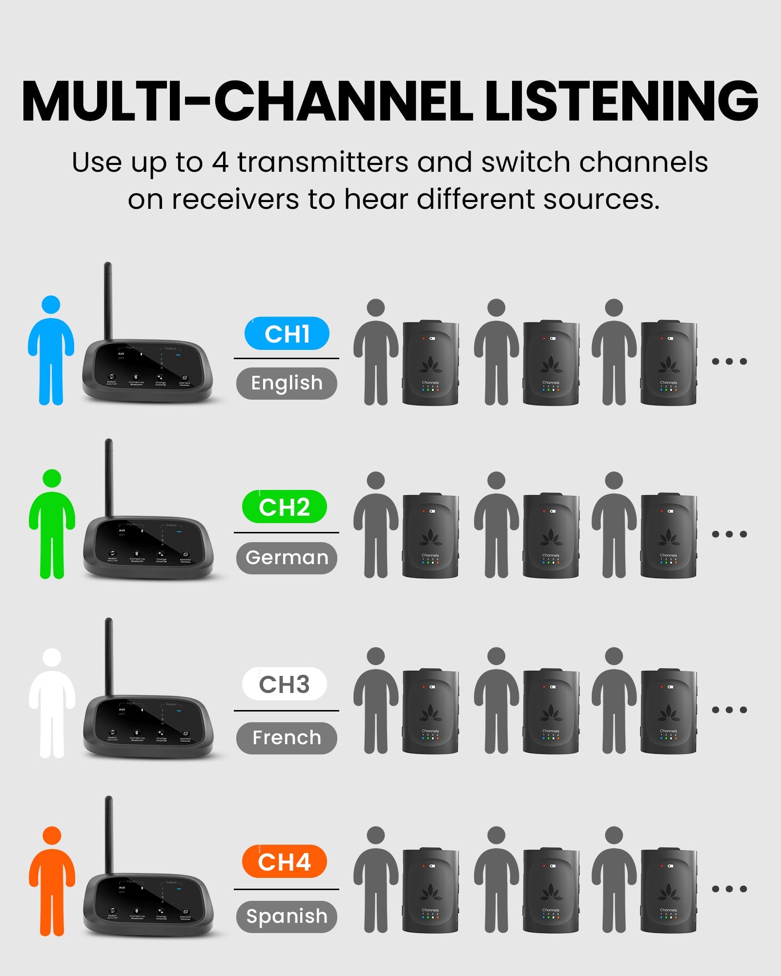 Wireless Audio Transmitter with Optical / AUX / Bluetooth Inputs, and Mic Support, 165ft Range, Multi-Channel for Group Listening