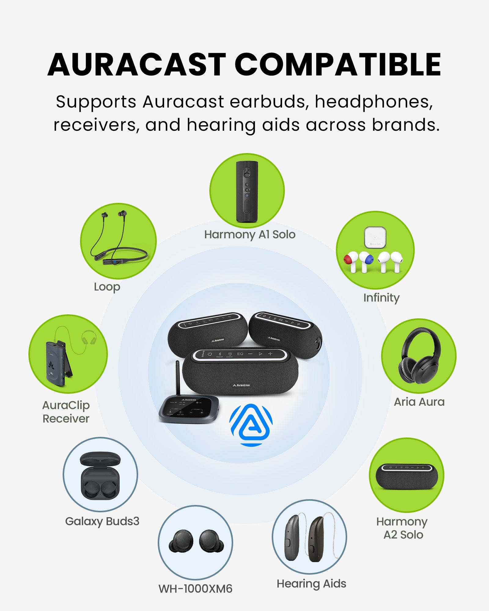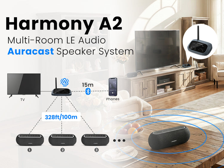 A: You can connect multiple Harmony A2 speakers to one transmitter for group playback. The system can also stream to other Auracast-compatible speakers or headphones.