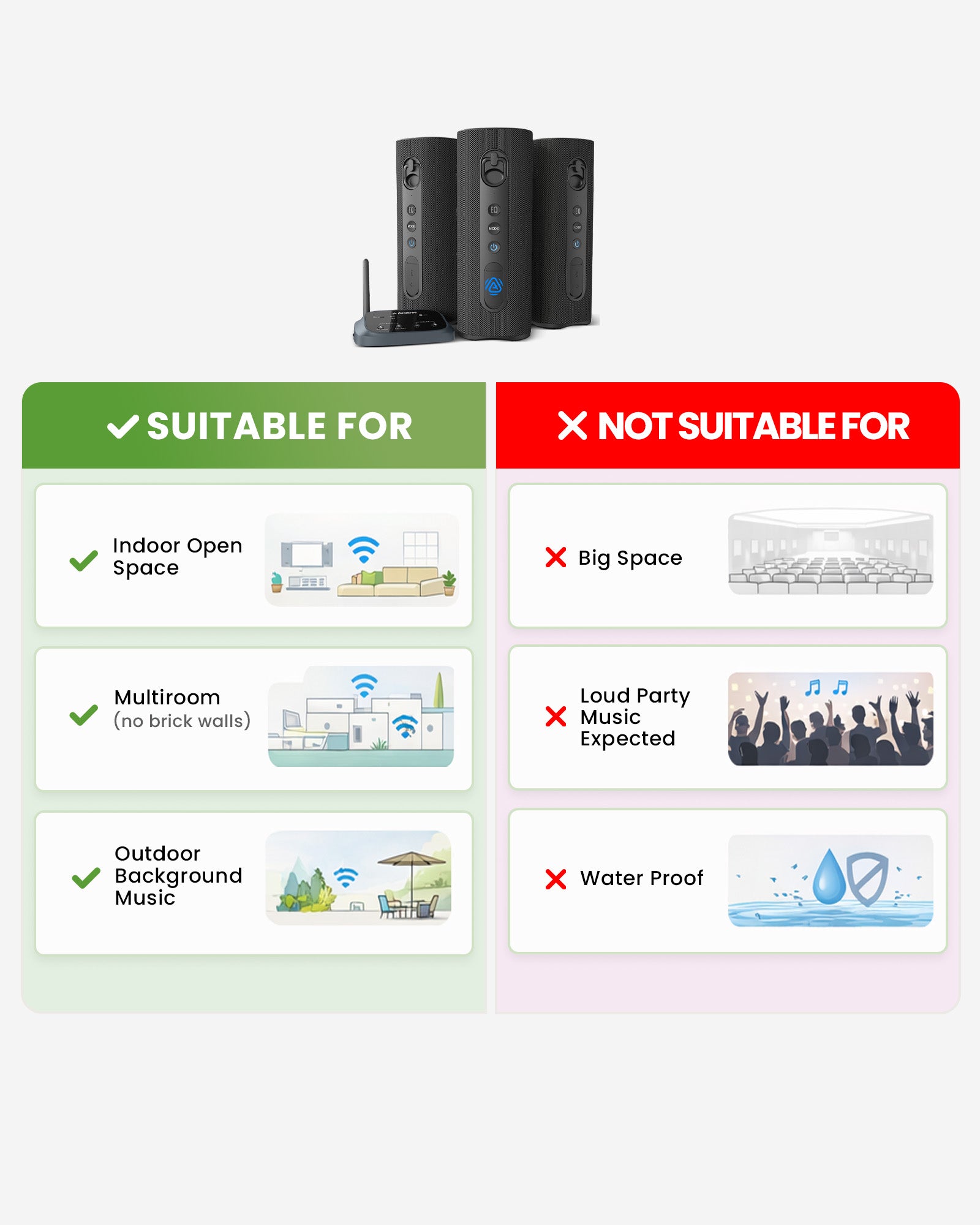 A: Yes. Harmony A1 supports wireless audio up to 100 meters (328 ft), making it ideal for large homes, garages, and party areas—far beyond standard Bluetooth range.