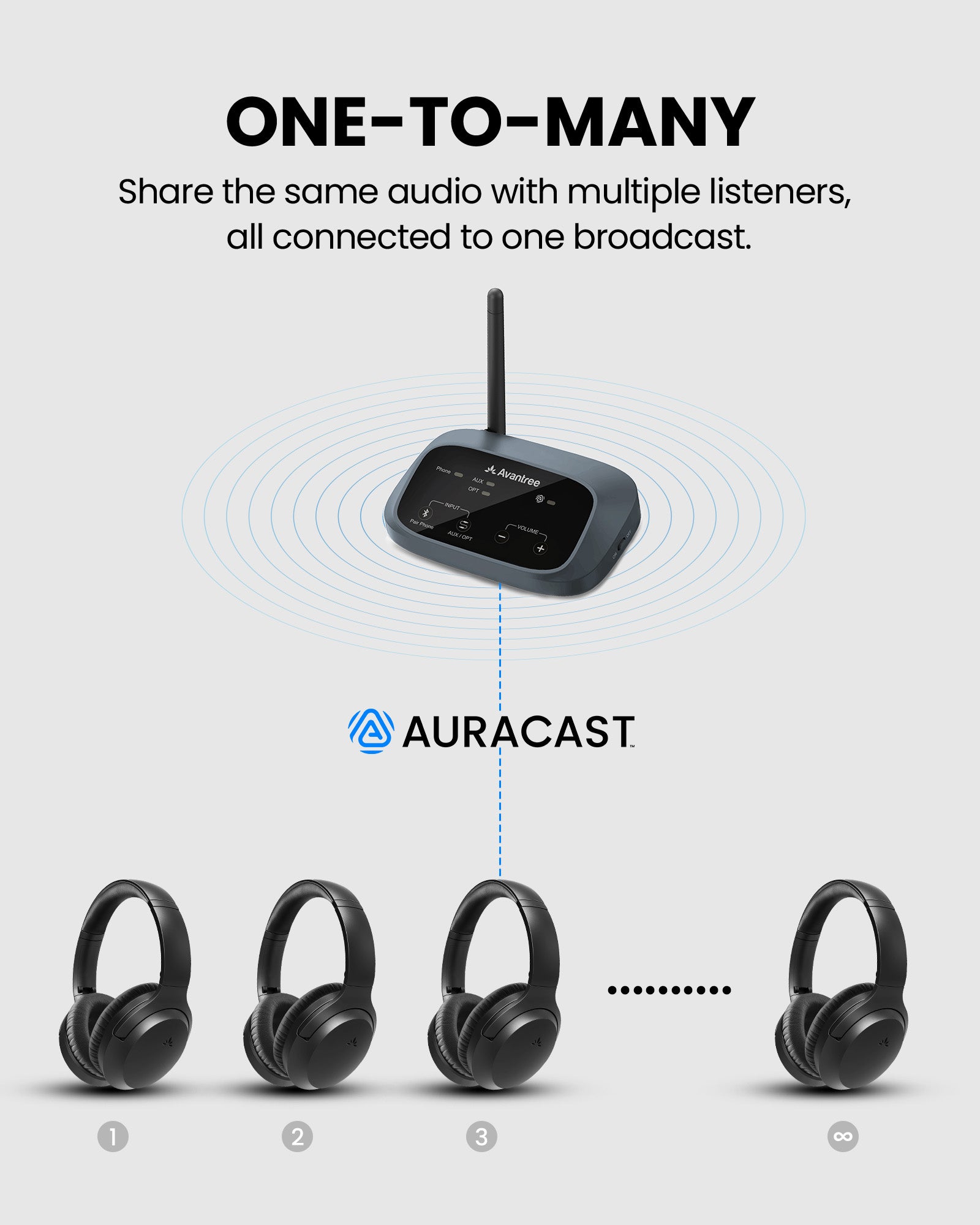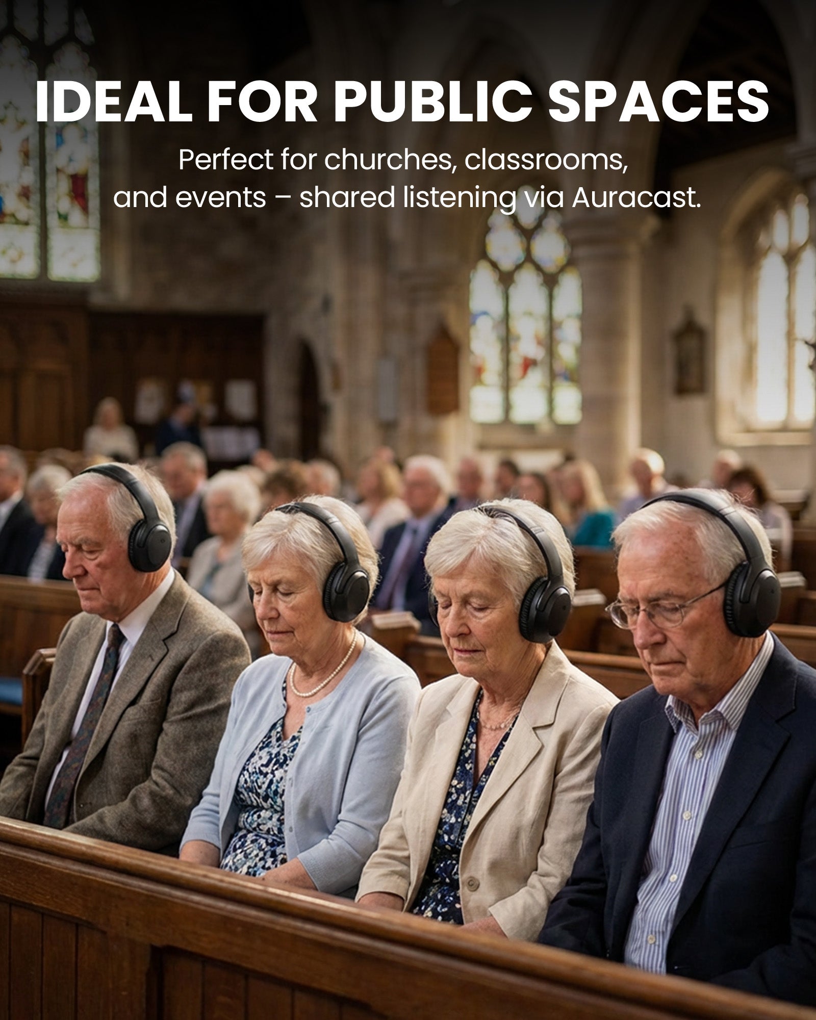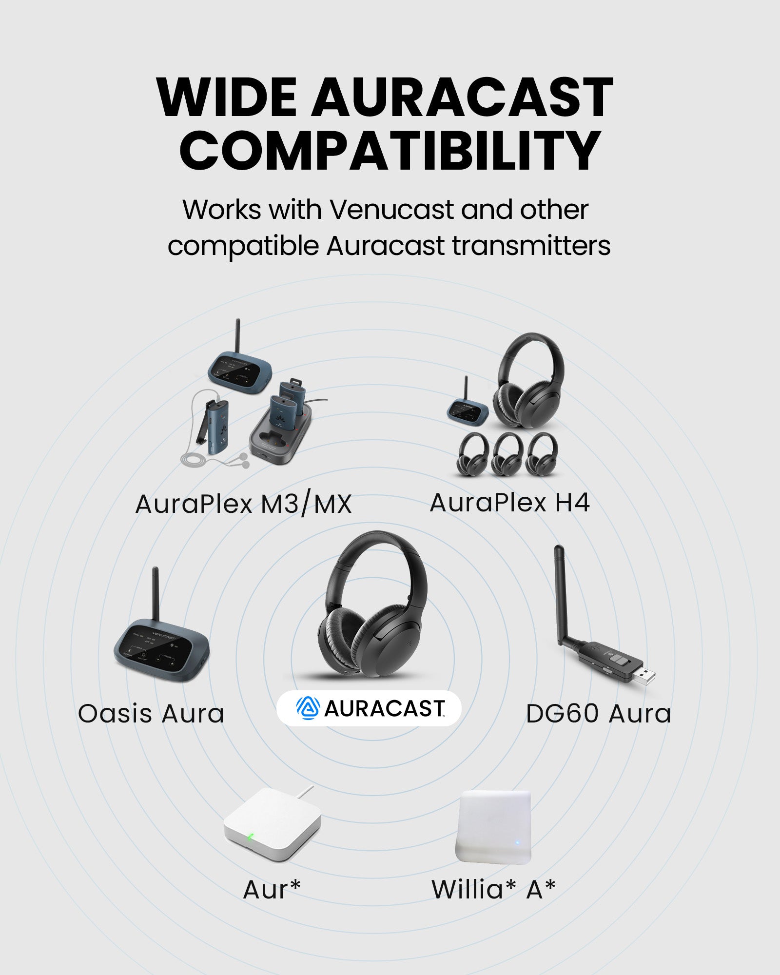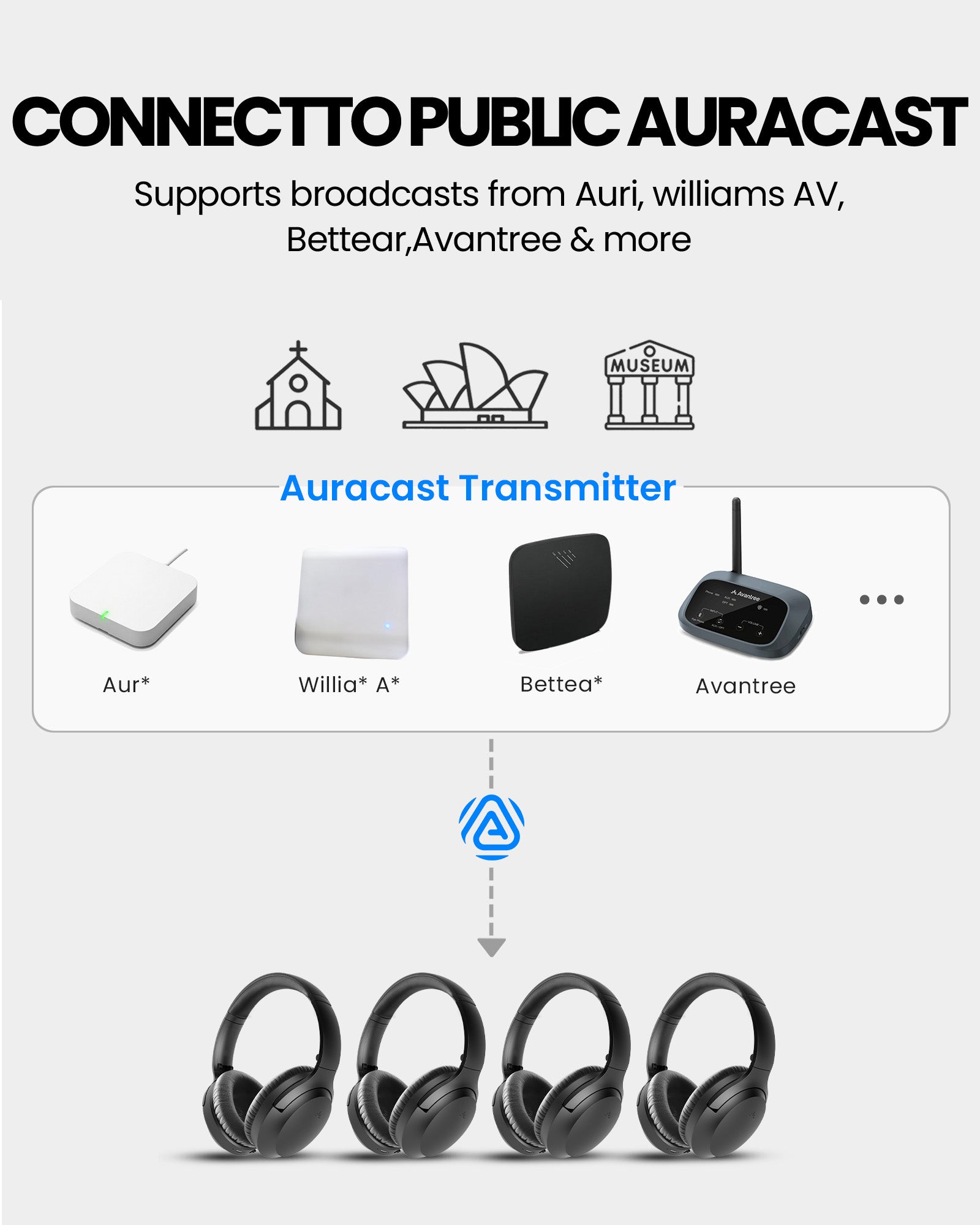 A: Yes. With a compatible Auracast transmitter, one audio source can broadcast to multiple Aria Aura headphones at the same time – so everyone can listen together at their own preferred volume.
