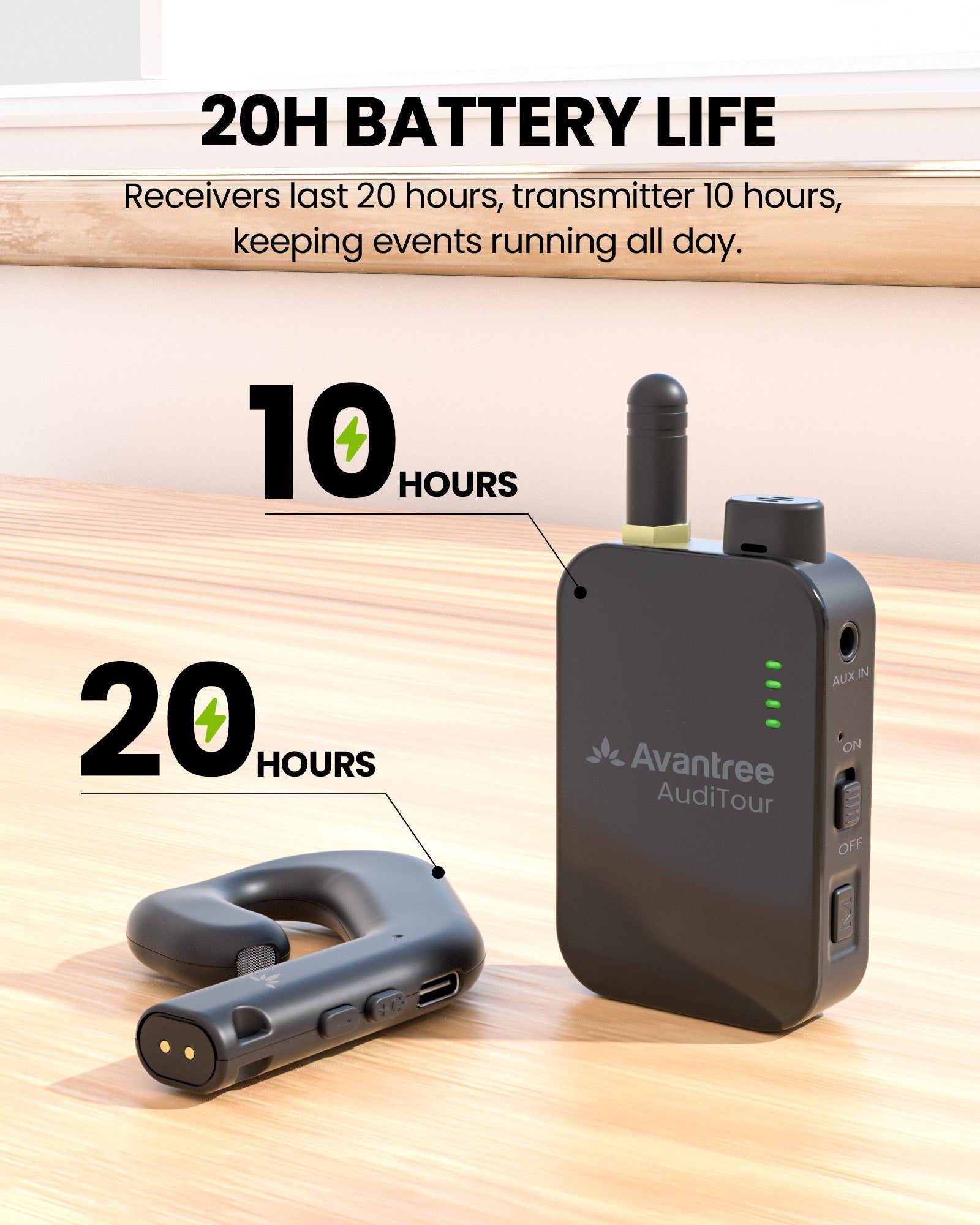 A3: The receiver headsets last up to 20 hours per charge, and the transmitter runs up to 10 hours – more than enough for a full day of use.
