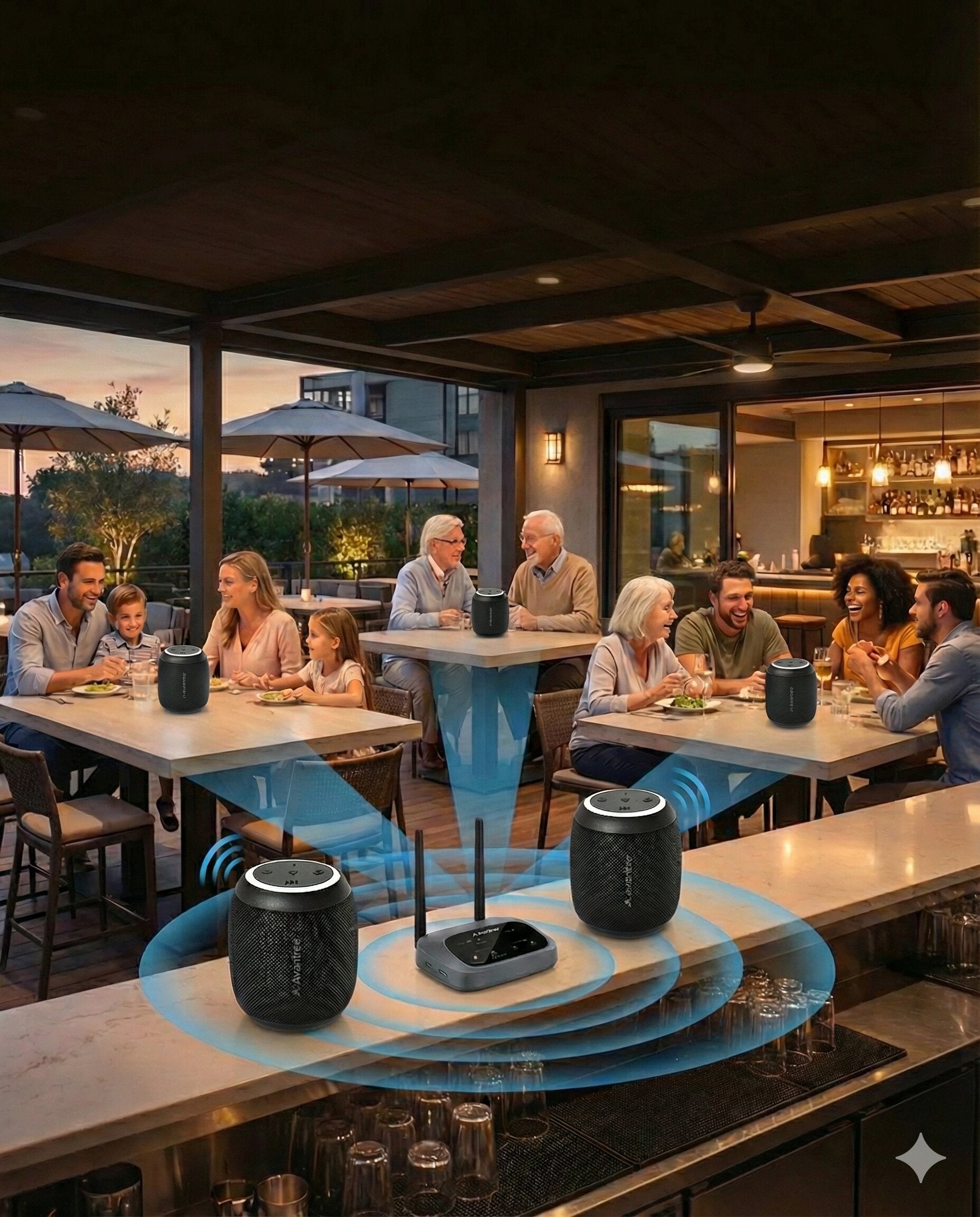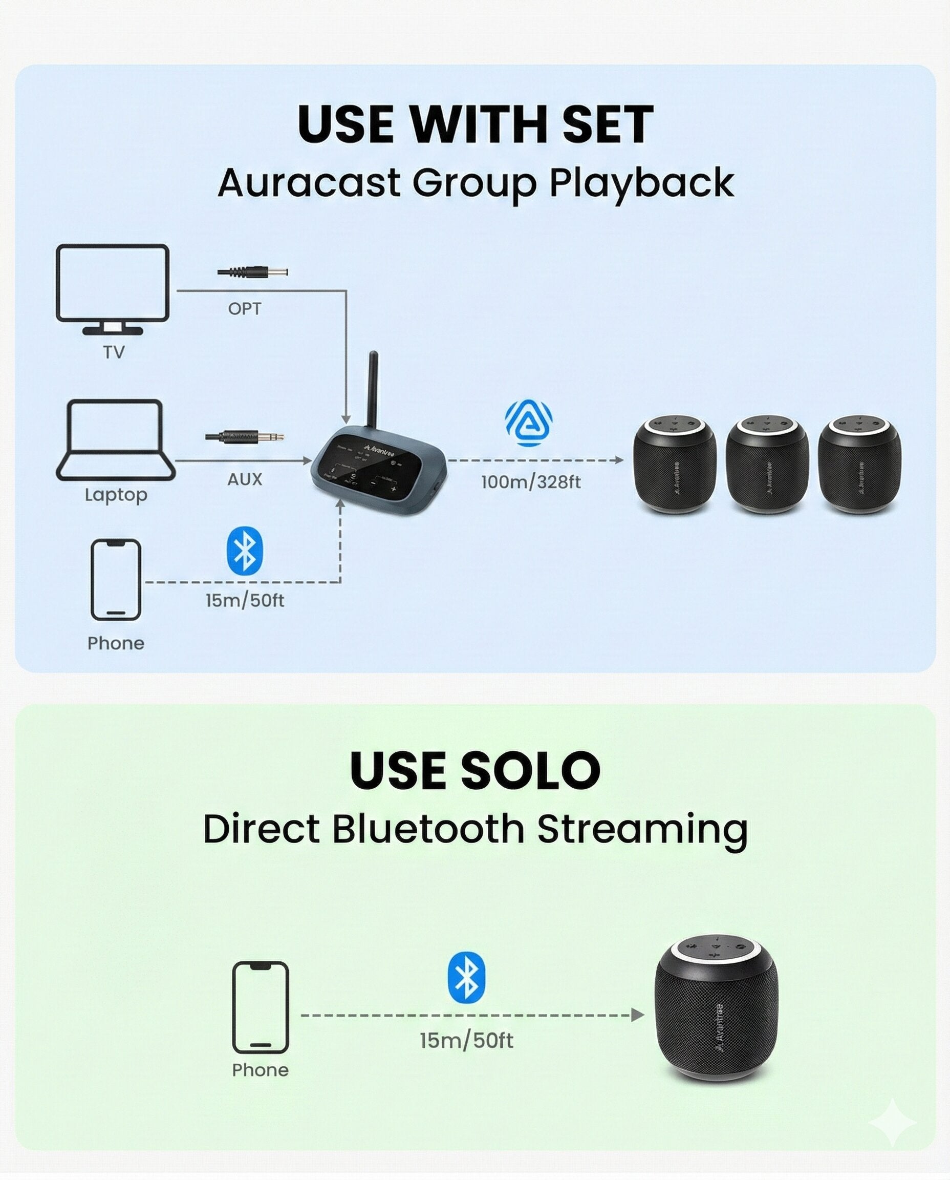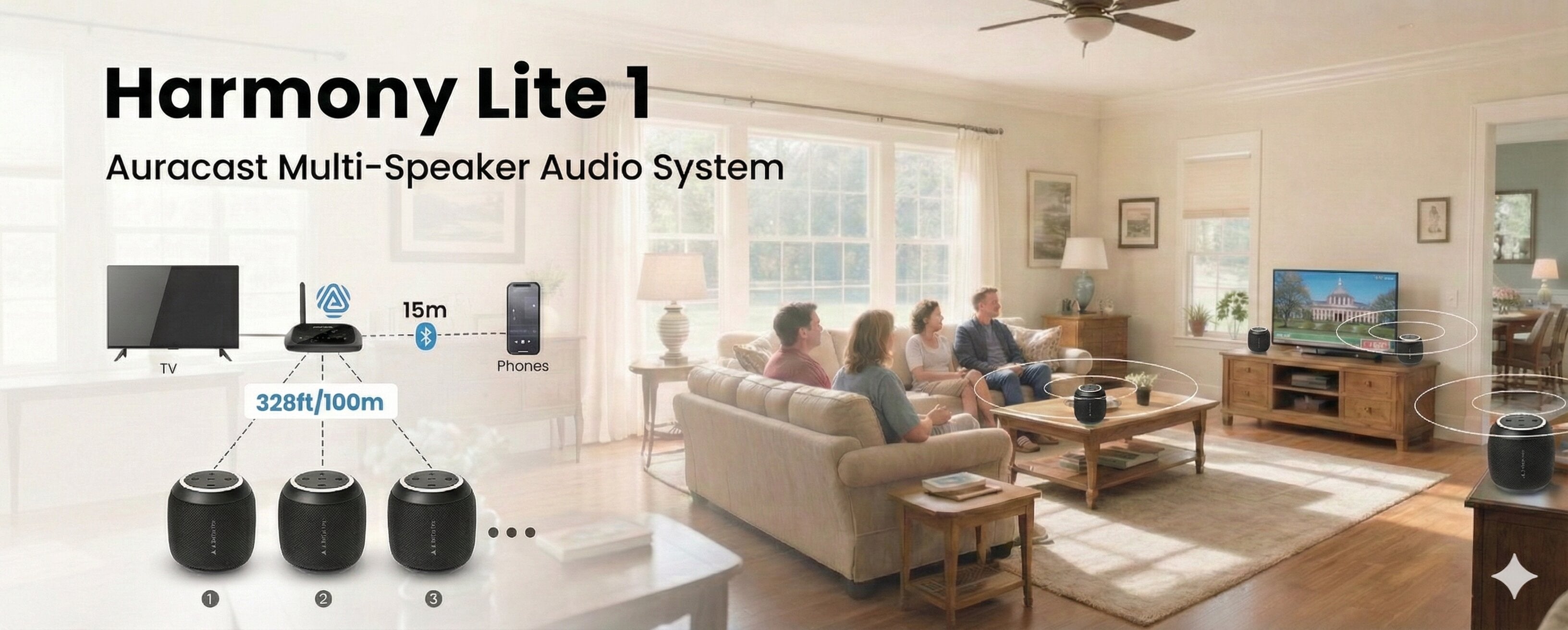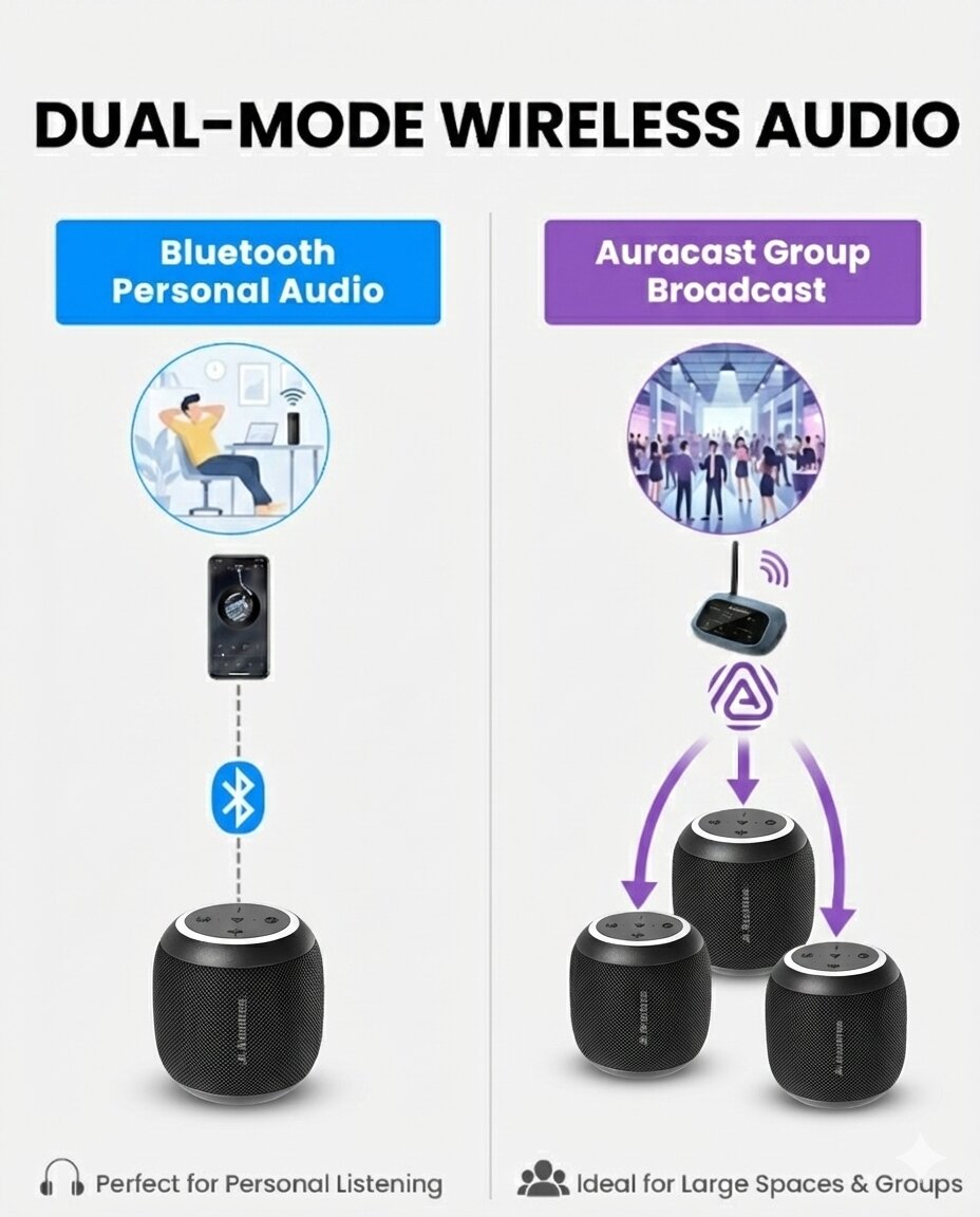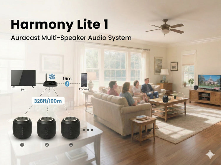 Harmony Lite 1 – Auracast Bluetooth 5.4 Transmitter + 3 Sync Speakers, Expandable Wireless Audio System