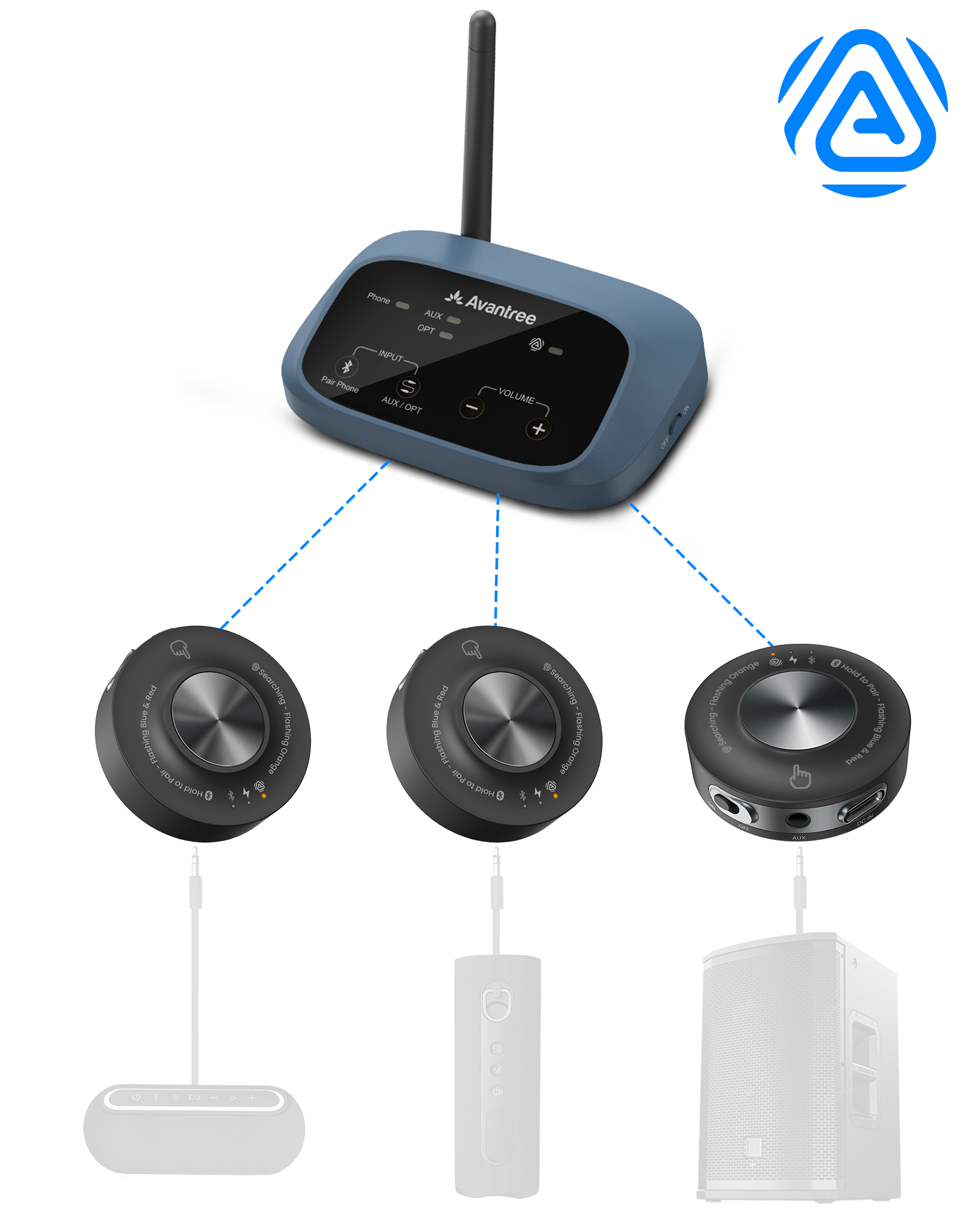Auracast Bluetooth 5.4 Wireless TV Transmitter with 3 Speaker Receivers (1 TX + 3 RX), One-to-Many Audio System for TV, Speakers & PA Systems, Qualcomm Chip, 328ft Long Range