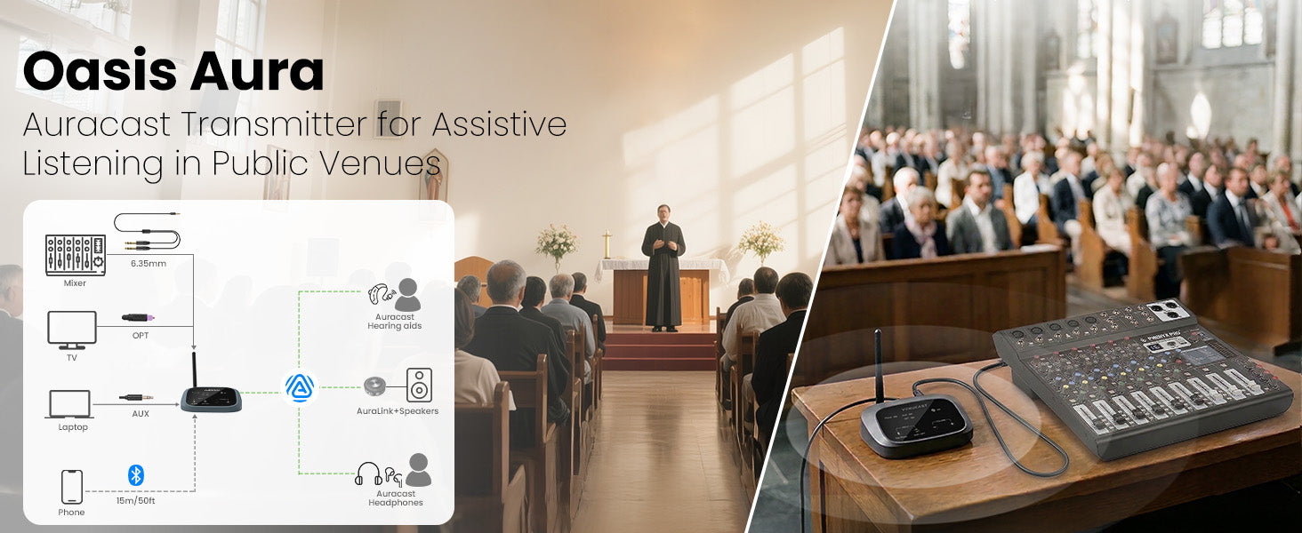 Oasis Aura supports Optical (TOSLINK), 3.5 mm AUX, and Bluetooth audio input. Simply connect it to your TV or PA system to broadcast audio wirelessly via Auracast.