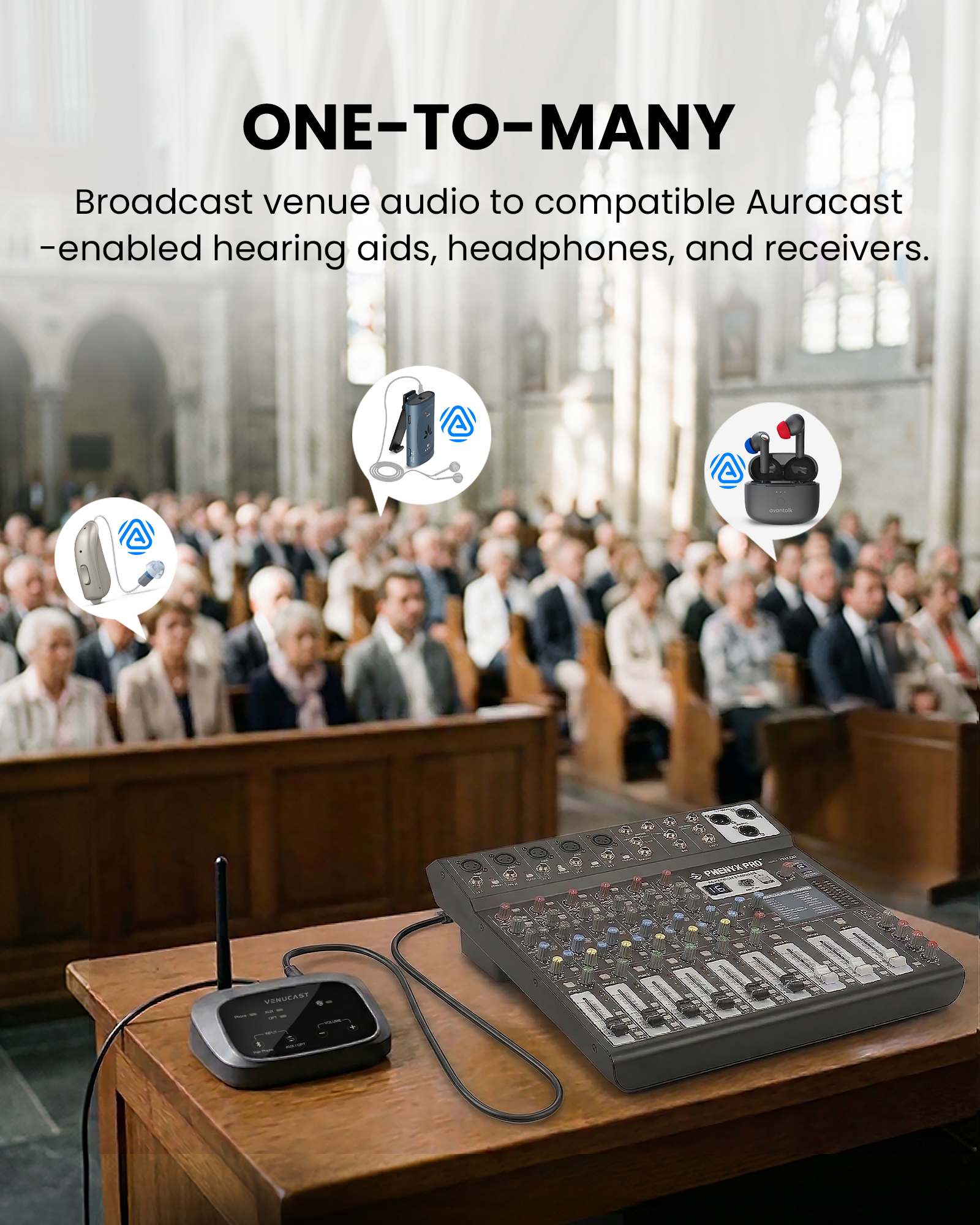 Broadcast sermons over Auracast™ — directly to hearing aids, headphones, or shared receivers. No pairing, no limitations, fully open listening for every member.