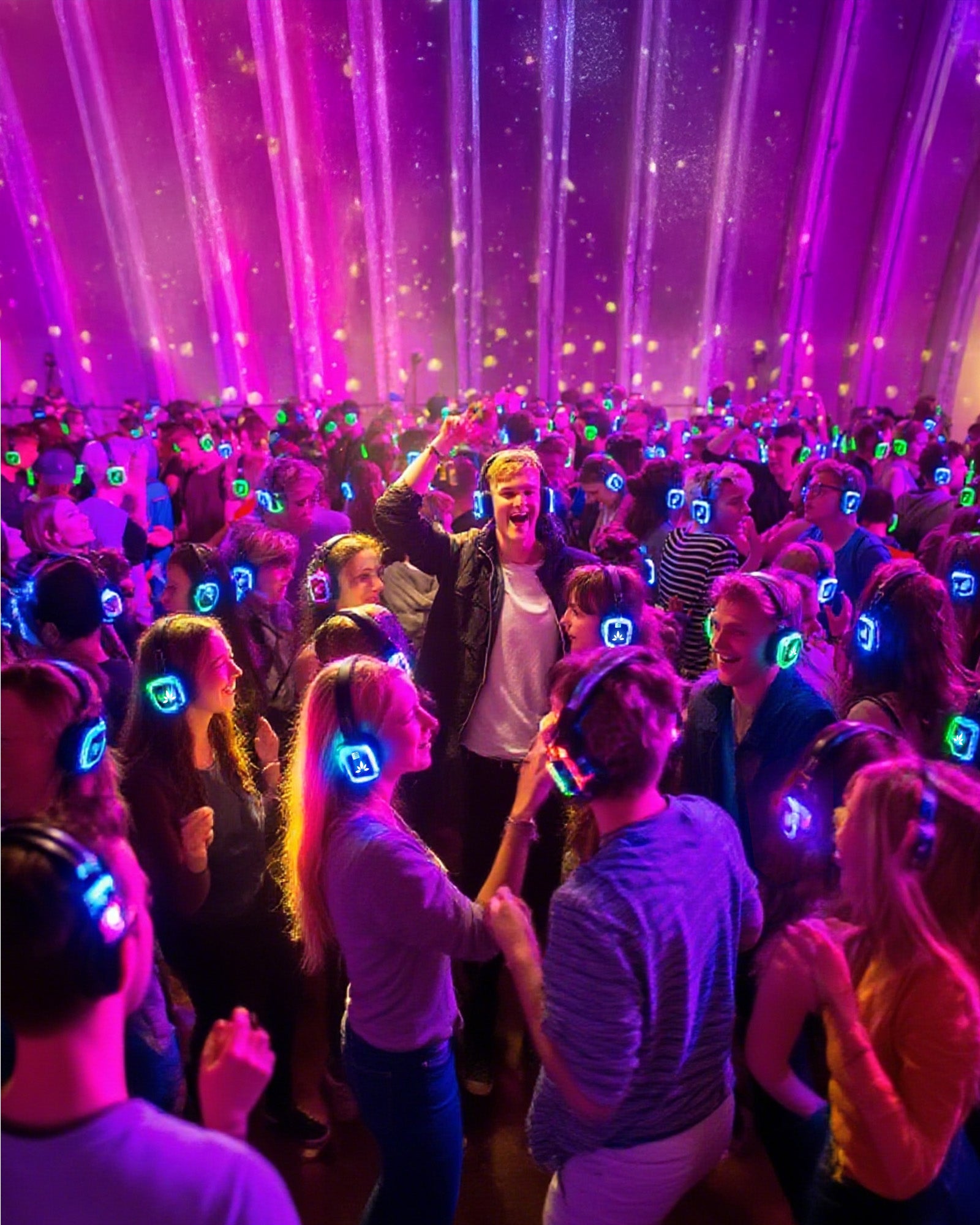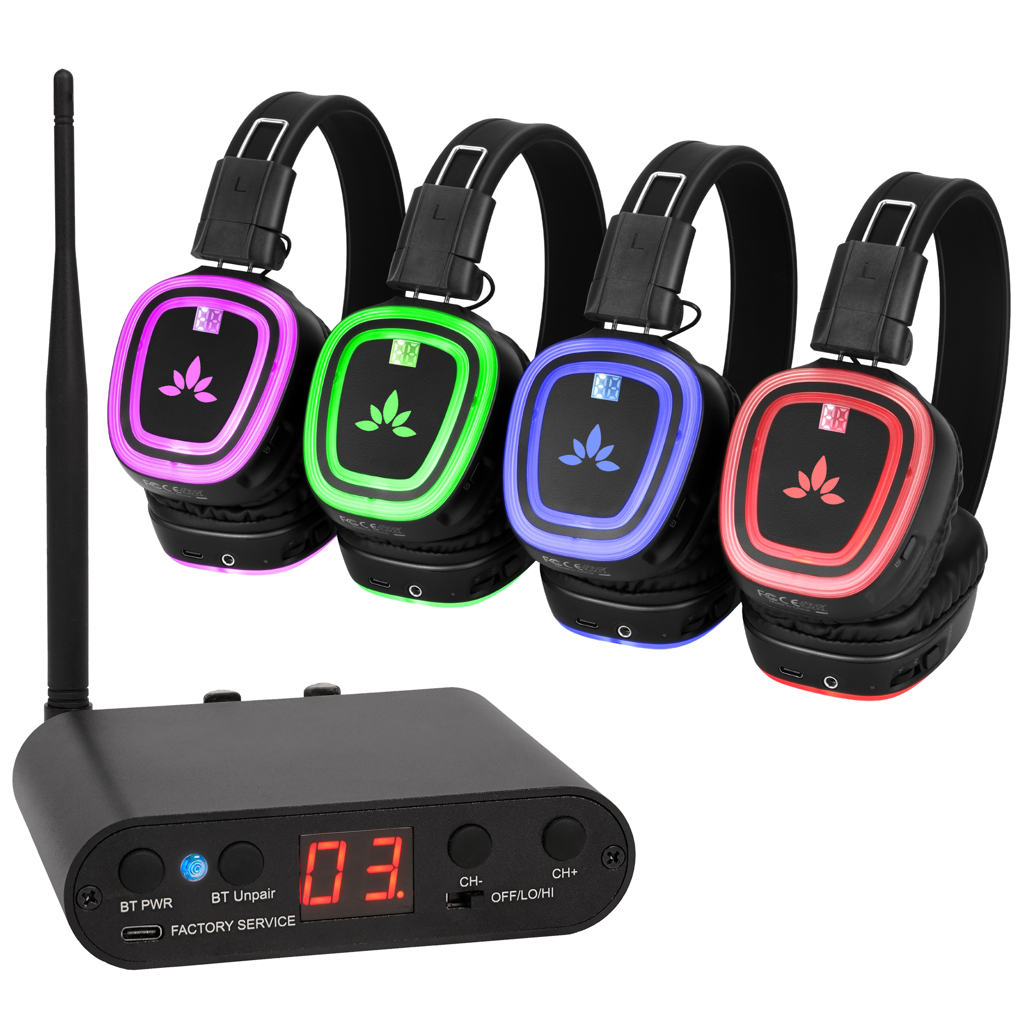 3-channel UHF wireless headphone system for Silent Disco, conferences and classes, with long-range, stable audio and easy channel switching on the headphones.